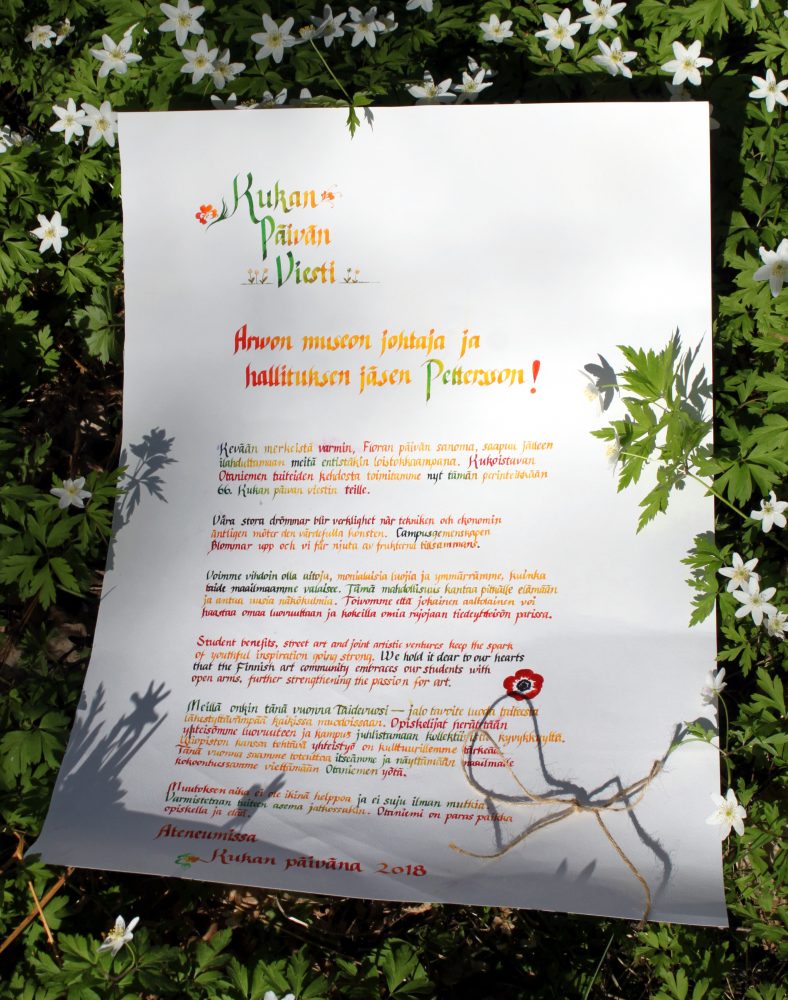 Aalto-yliopiston ylioppilaskunta AYY luovutti Kukanpäivän 13.5.2018 kiitostervehdyksen Ateneumin museonjohtaja Susanna Petterssonille.