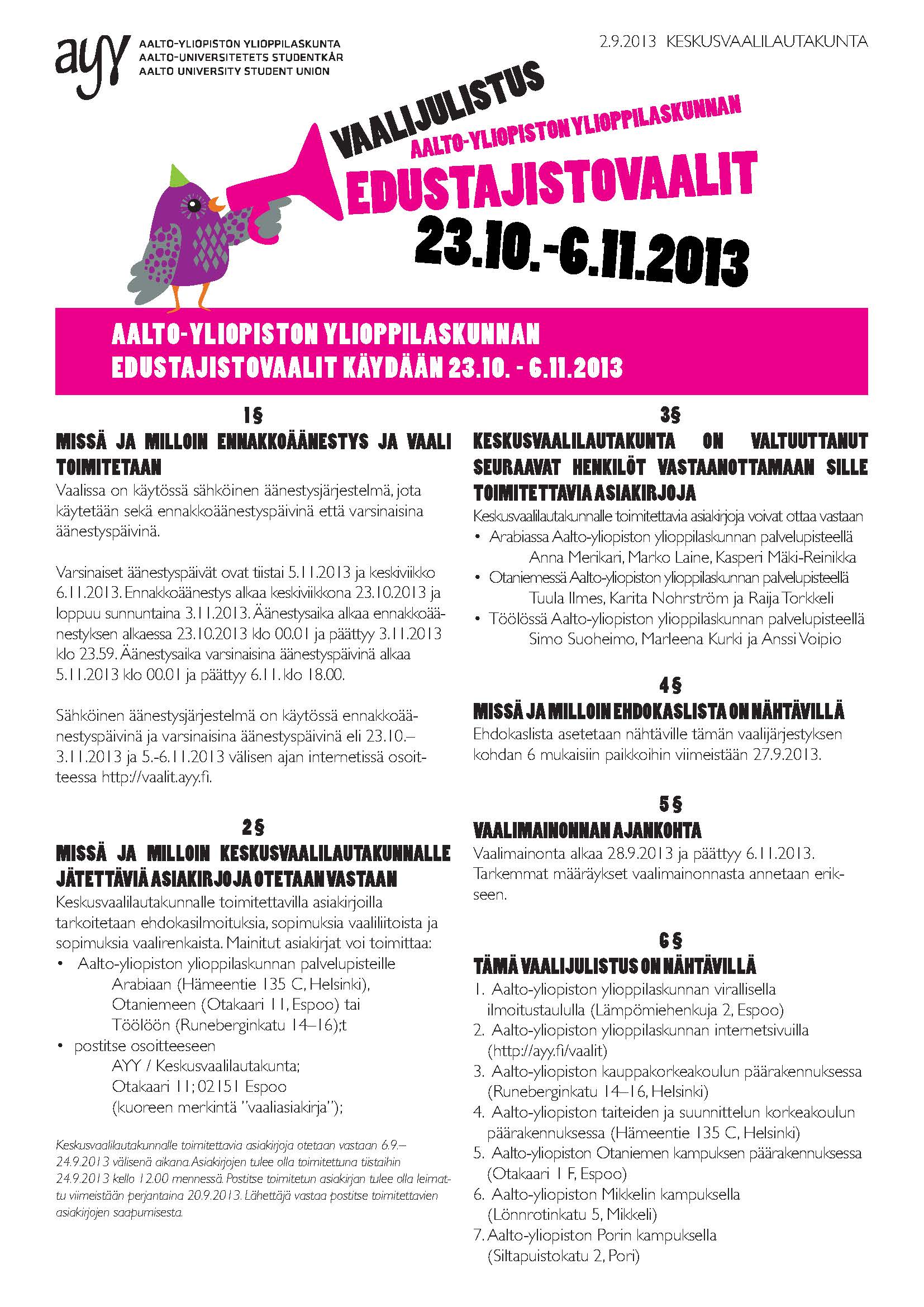 Ehdokaslistat numeroineen julkaistaan perjantaina 27.9. osoitteessa ayy.fi/vaalit, sekä muissa vaalijulistuksessa määritellyissä paikoissa. Vaalijulistus löytyy täältä.