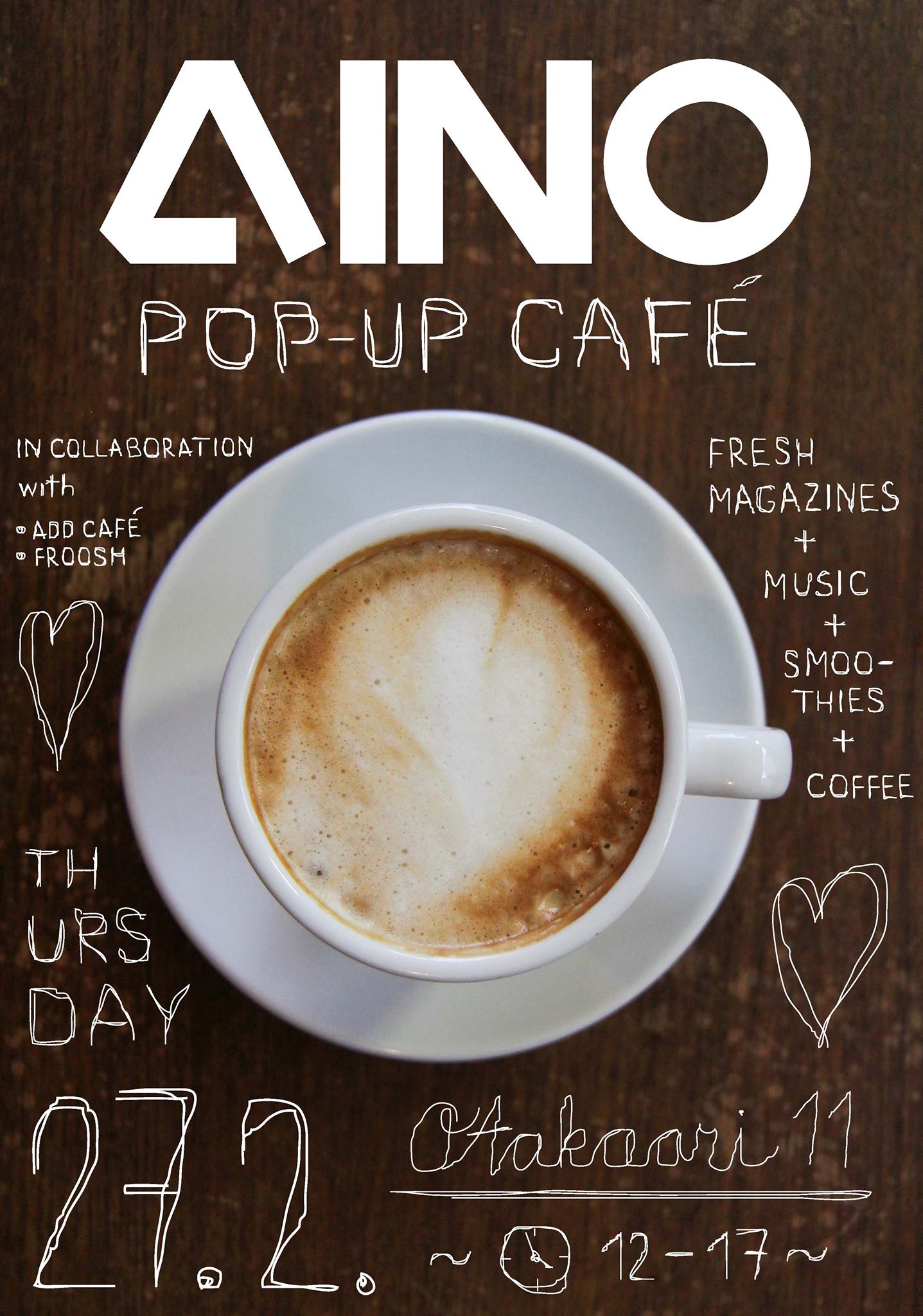 AINO 1/2014 ilmestyy! Sen kunniaksi AINOn toimitus perustaa yhdeksi päiväksi kahvilan AYY:n keskustoimistolle torstaina 27.2. klo 12-17. Tarjolla ADD CAFEn erinomaista kahvia, Frooshin smoothieita, letkeää musiikkia ja painotuoreita lehtiä. Tervetuloa! Tuo kaveritkin!
