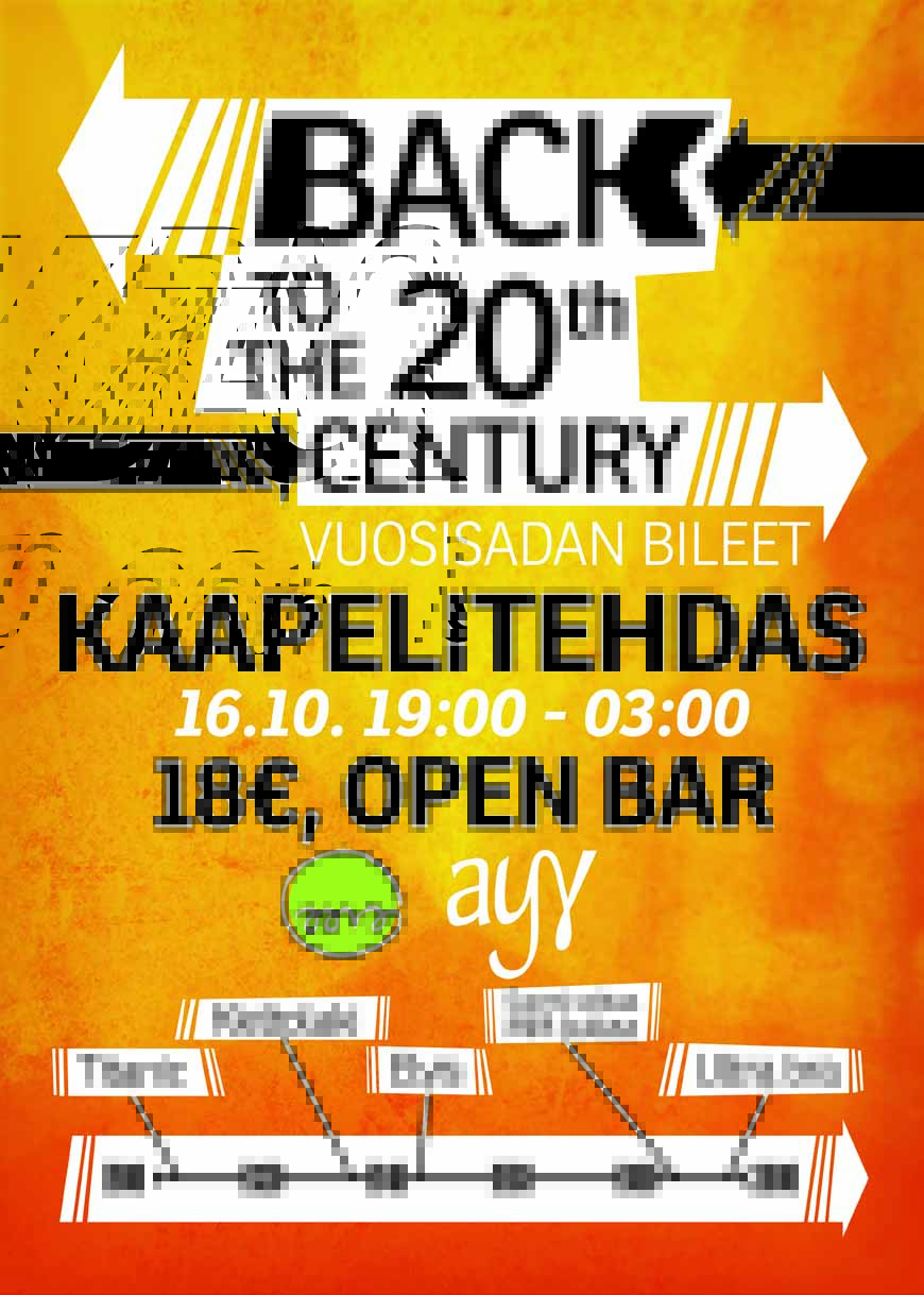Koe vuosisadan bileet 1900-luvun alusta loppuun tiistaina 16.10. Kaapelitehtaan Puristamossa! Illan aikana ollaan mukana Titanicin viimeisillä hetkillä, lavalla nähdään rockin Kuningas ja fiilistellään Ultra Bran viimeistä keikkaa. Kieltolain iskiessä kannattaa pitää silmät auki hedelmäkauppiaiden ja muiden hiippareiden varalta. Loppuillasta levyjä pyörittää DJ EAS ja MPH.