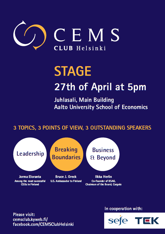 The CEMS Club Helsinki has the pleasure to invite you to CEMS Stage 2012, organized at the Aalto University School of Economics!