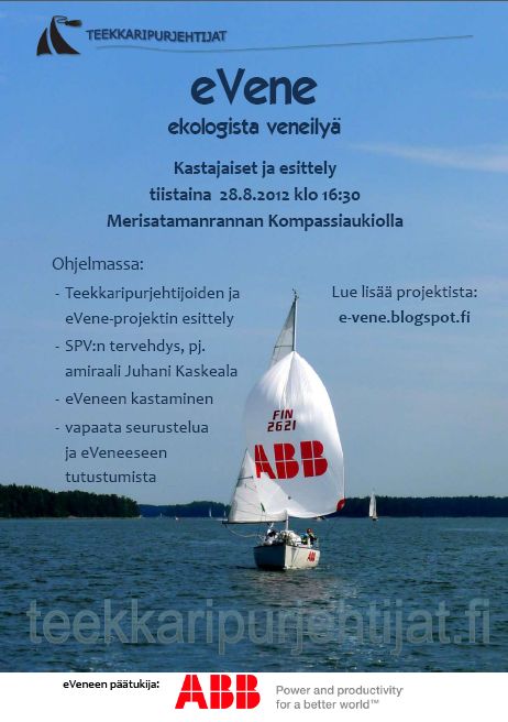 Teekkaripurjehtijat teki purjehduksesta vieläkin ekologisempaa eVene-koeprojektillaan. Projektissa haiseva diesel vaihdettiin hiljaisesen sähkömoottoriin ja myrkkymaalit korvattiin akustisella eliönestolla. Vene kastetaan tiistaina 28.8.2012 Helsingin Merisatamassa. Venettä ja hankkeen kulkua esitellään yleisölle klo 15:30 alkaen. Ohjelma alkaa klo 16:30. Kaikki kiinnostuneet ovat tervetulleita!