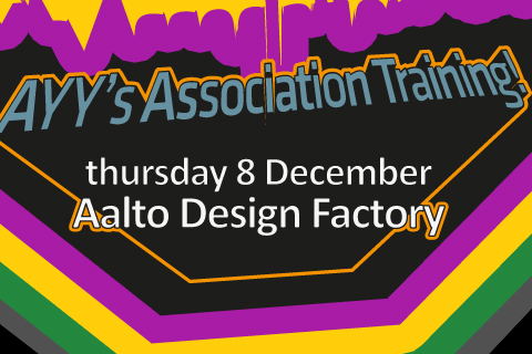 3.11.2011 Association Training 8 Dec at Design Factory Info @en Leave a comment Associations: Now is the time to sign up for AYY’s Association Training! Sign up yourself in here.