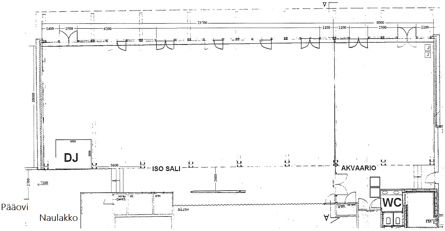 Huomioithan, että tilassa on juhlittu monet mahtavat juhlat ja mm. koristeluista on katossa niittejä muistona.