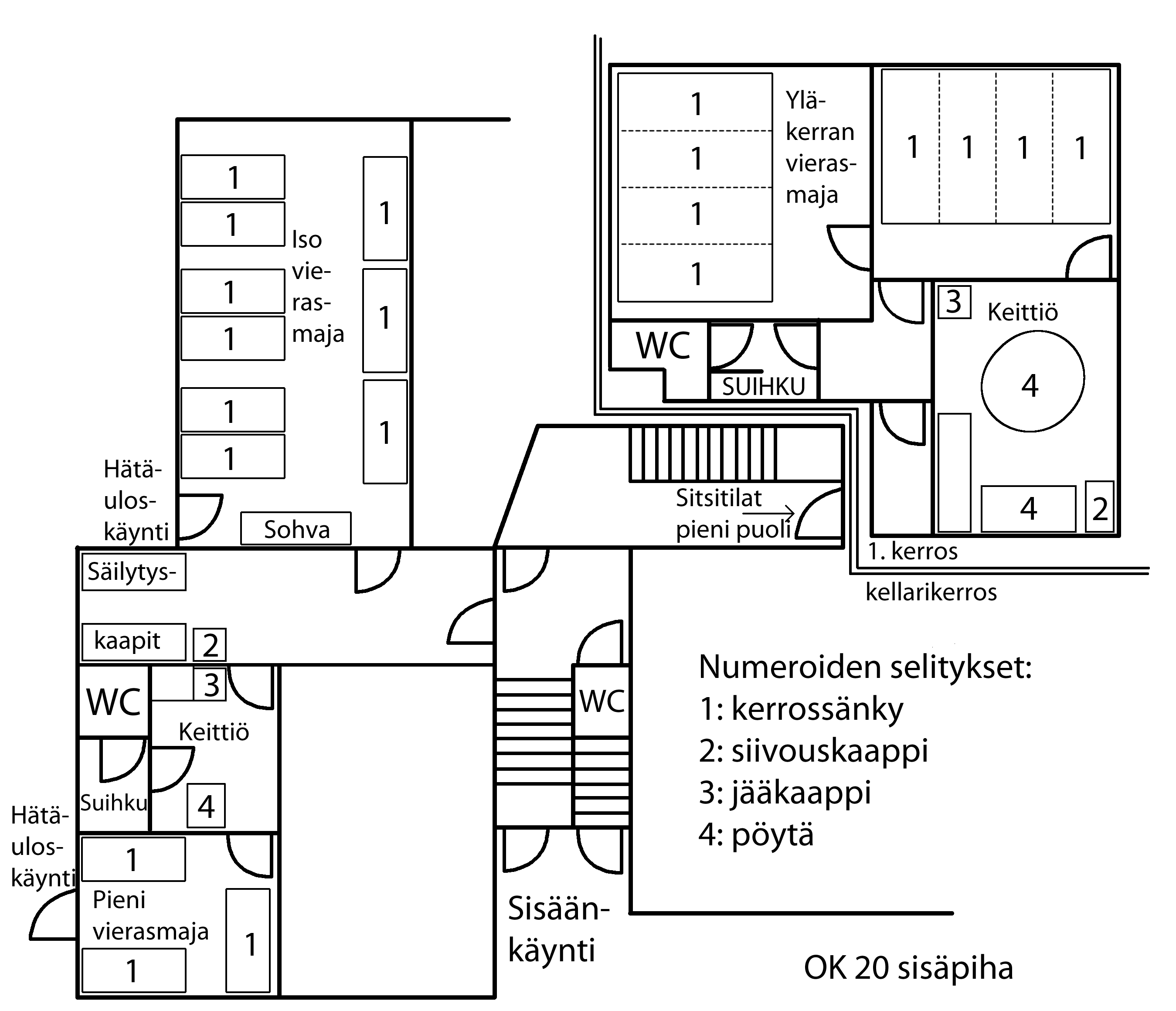 Yläkerran vierasmaja sijaitsee OK20 pienen puolen yläpuolella. Tilassa on kaksi isoa kerrossänkyä, joihin mahtuu mukavasti 4 ihmistä vierekkäin eli yhteensä 16 henkilöä. Mikäli läheisyys ei haittaa, niin sänkyihin saa kyllä mahtumaan ainakin 24 henkilöä.