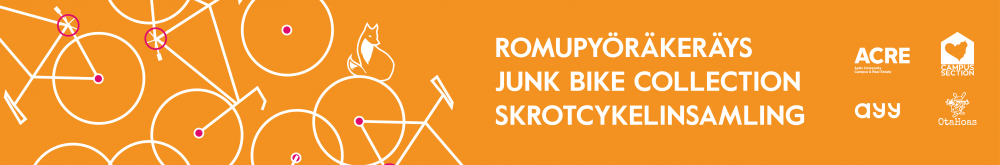 Romupyöräkeräys on AYY:n Kampusjaoston, OtaHoasin ja ACRE:n yhteistyötalkoo Otaniemen pyöräkellarien ja -telineiden siistimiseksi. Kysymykset ja tiedustelut keräyksestä voi osoittaa Kampusjaostolle osoitteeseen kampusjaosto[at]list.ayy.fi.